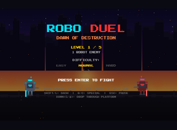 ROBO DUEL: Dawn of Destruction Steel clashes. Lasers blaze. Only one mech survives. Step into a ruined future and fight your way through fast, high-impact robot battles. Slash with energy blades, fire precision shots, dash through danger, and unleash devastating specials in a retro-styled 2D arena. Master the fight: Tight arcade combat with sword + gun play Skill-based movement, combos, and timing Upgrade your mech between battles Face escalating enemies and a final boss showdown Built for instant action, packed with style, and made for players who love pure combat. ROBO DUEL Fight hard. Upgrade smart. Survive the dawn
